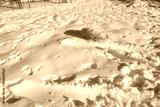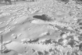 The dog is light colored in the snow. Animal. The texture of the snow surface. Human footprints in the snow. Winter. Rest in Crimea. Crimean mountains. Footwear prints.