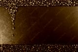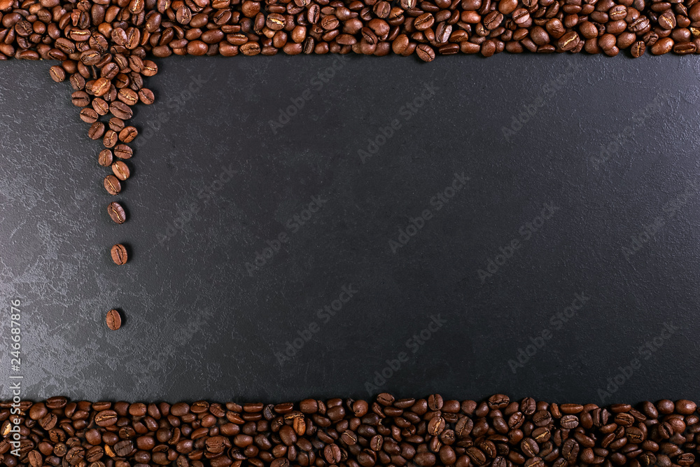 Aroma roasted coffee beans on rustic tabletop, brown banner background.