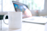 cup of coffee and laptop on the table. Coffee mug and notebook on the table in office working interior.