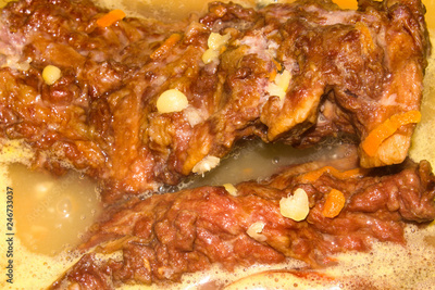 Smoked meat in pea soup.Pea soup with smoked meats.