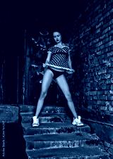 beautiful young woman raises the hem of a short dress. girl shows her panties on a gray wall in abandoned building