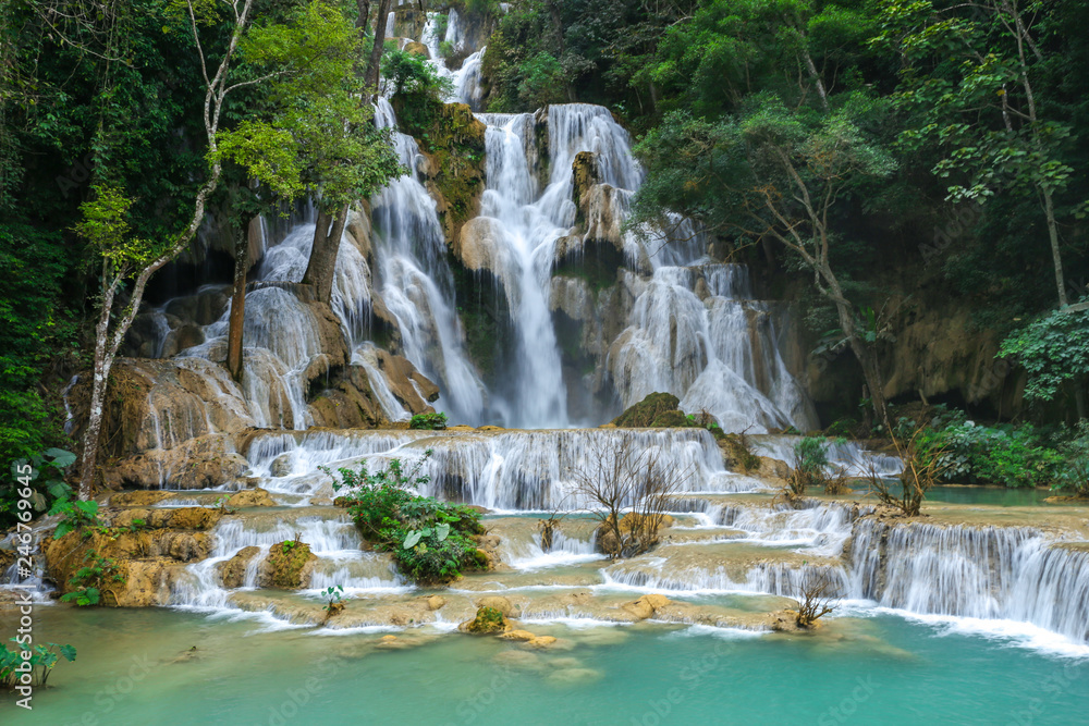 Nong Khiaw, Laos – December 12, 2018: Traditional Laos long tail boat in green waters of Nam Ou river in Nong Khiaw village in north Laos.