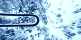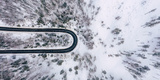 Curvy windy road in snow covered forest, top down aerial view. Winter landscape.