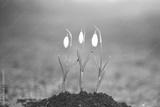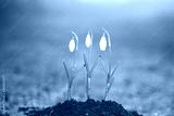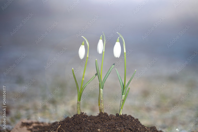 The snowdrop blooms on a spring sunny day under the snow. Brilliant white background with blurry circles.