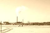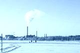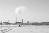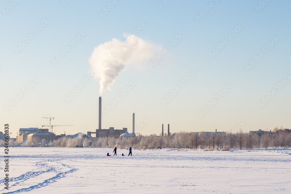 View of factory power plant in winter with steam rising into blue sky. People walking on the ice.