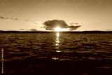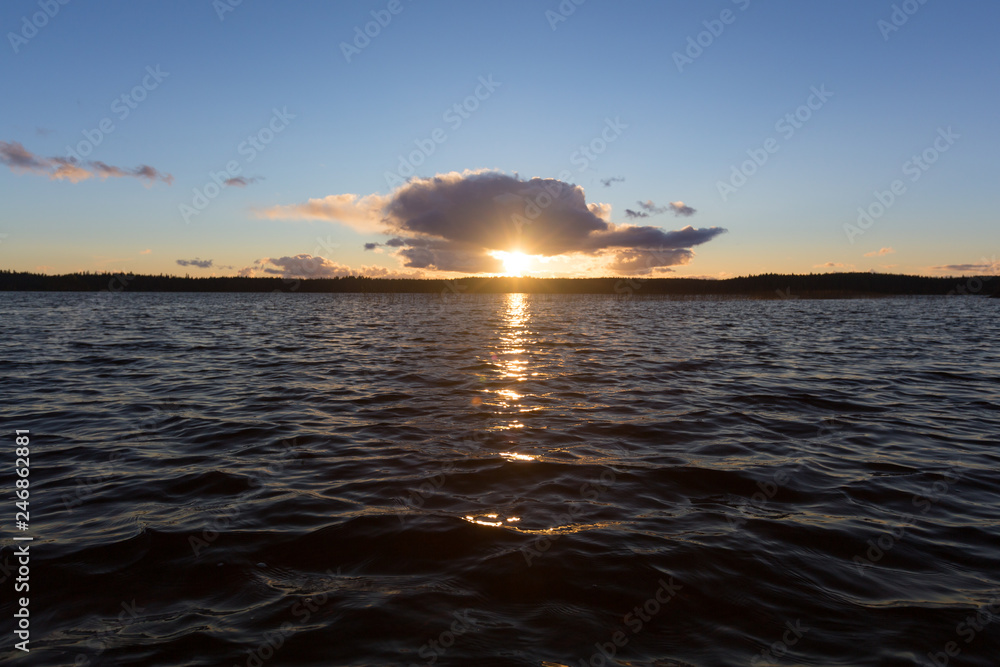 Beautiful sunset shines through the clouds on the lake in the summer. Finland