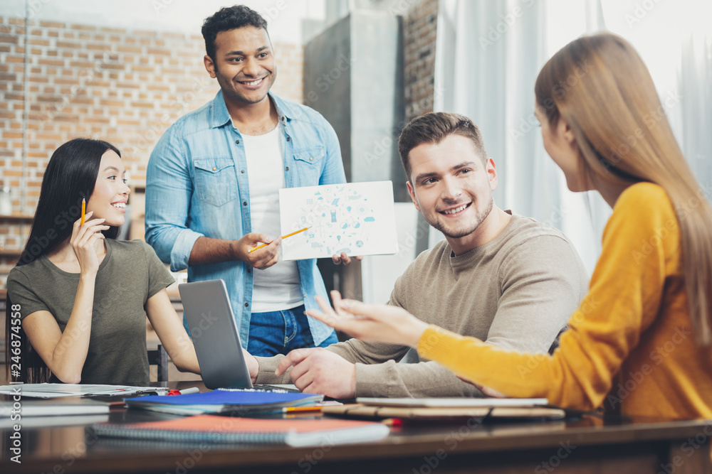 Attractive four students working on project