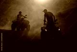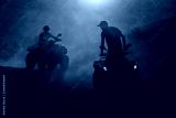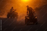 People enjoying driving atv on sunset in Valleys of Cappadocia with lot of dusts in background.