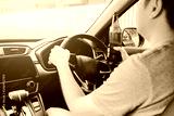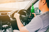 Asian men are breaking the traffic rules by holding a bottle of beer and drinking while driving.