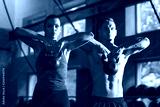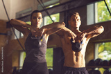 Man and woman doing exercise with weights. Bodybuilders training in a gym.