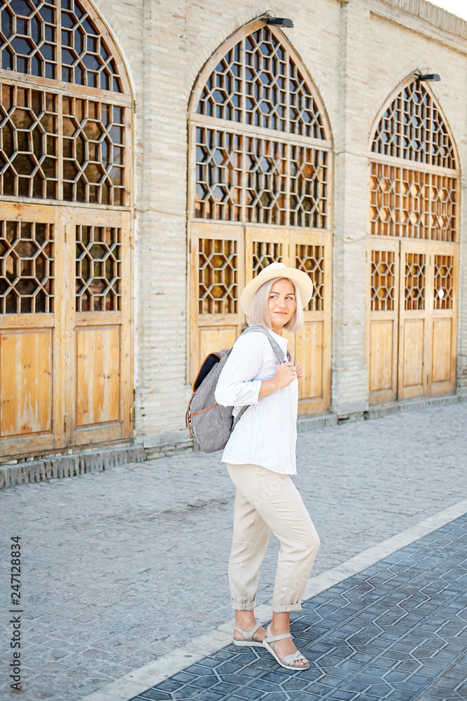 Young female traveler with backpack and with hat on the street. Travel concept. Uzbekistan, Bukhara