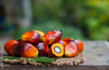 Palm Oil fruit of vegetable oil on old wooden floor.
