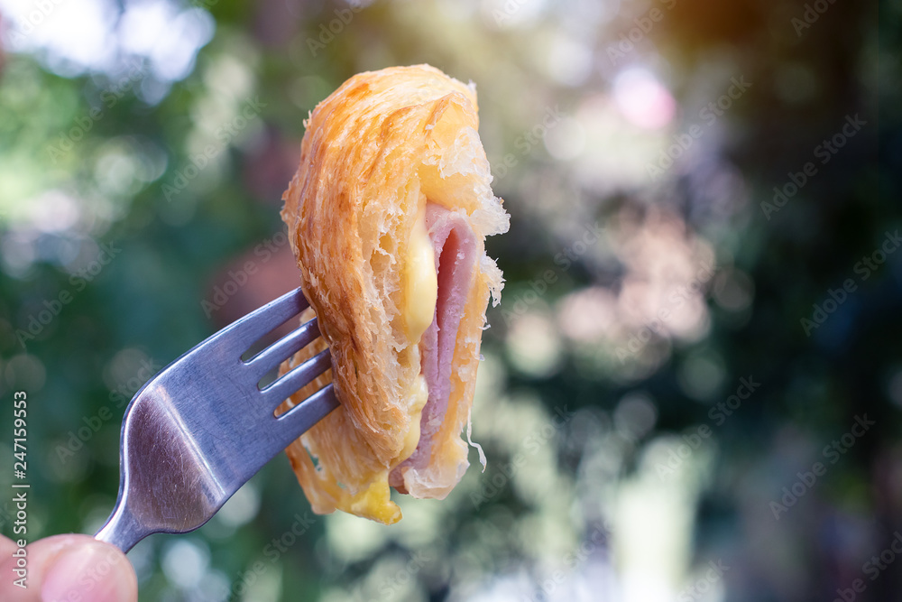 Croissant Ham with fork in the green nature background.
