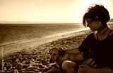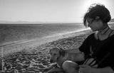 Young woman playing with her dog on beach in sunset light. Stylish girl / female having fun with funny dog. Cute moments on summer day vacation. Animal and human friendship, connection, trust concept.