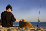 Young woman playing with her dog on beach in sunset light. Stylish girl / female having fun with funny dog. Cute moments on summer vacation. Animal and human friendship, connection, trust concept.