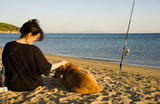 Young woman playing with her dog on beach in sunset light. Stylish girl / female having fun with funny dog. Cute moments on summer vacation. Animal and human friendship, connection, trust concept.