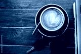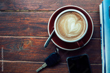 Cup of hot coffee,books,smart phone and keys on the wood plate