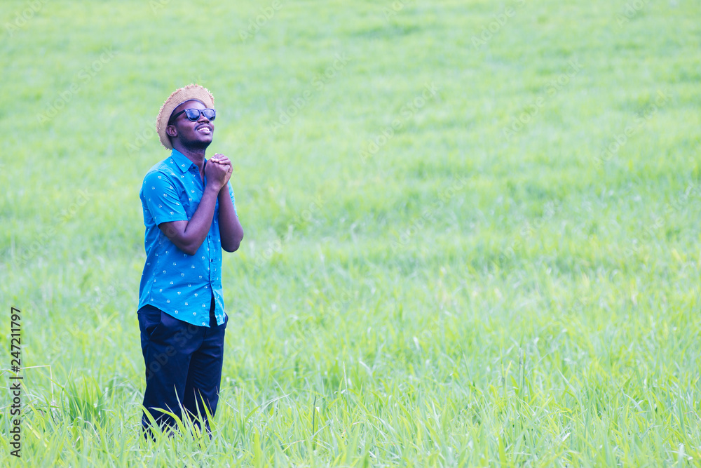 African man travelers stand pray for god and smile with happy among green meadows.