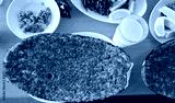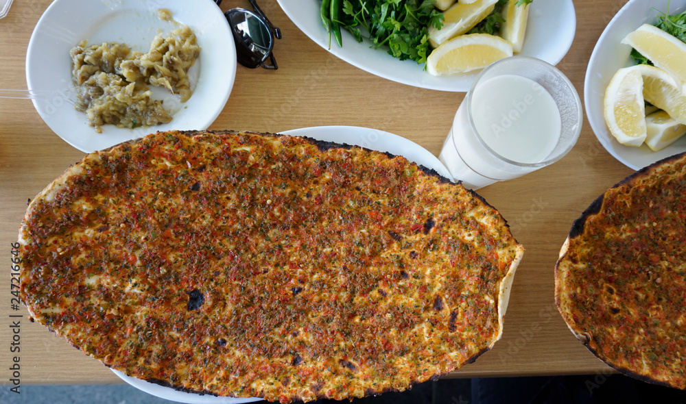 Delicious Turkish pizza lahmacun with appetizers / snacks on restaurant table. Famous, traditional and regional crunchy crispy food of Gaziantep, Turkey. Healthy lifestyle, nutrition, obesity concept.