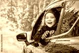 Happiness caucasian smiling boy looking out of black car window in winter sunny day