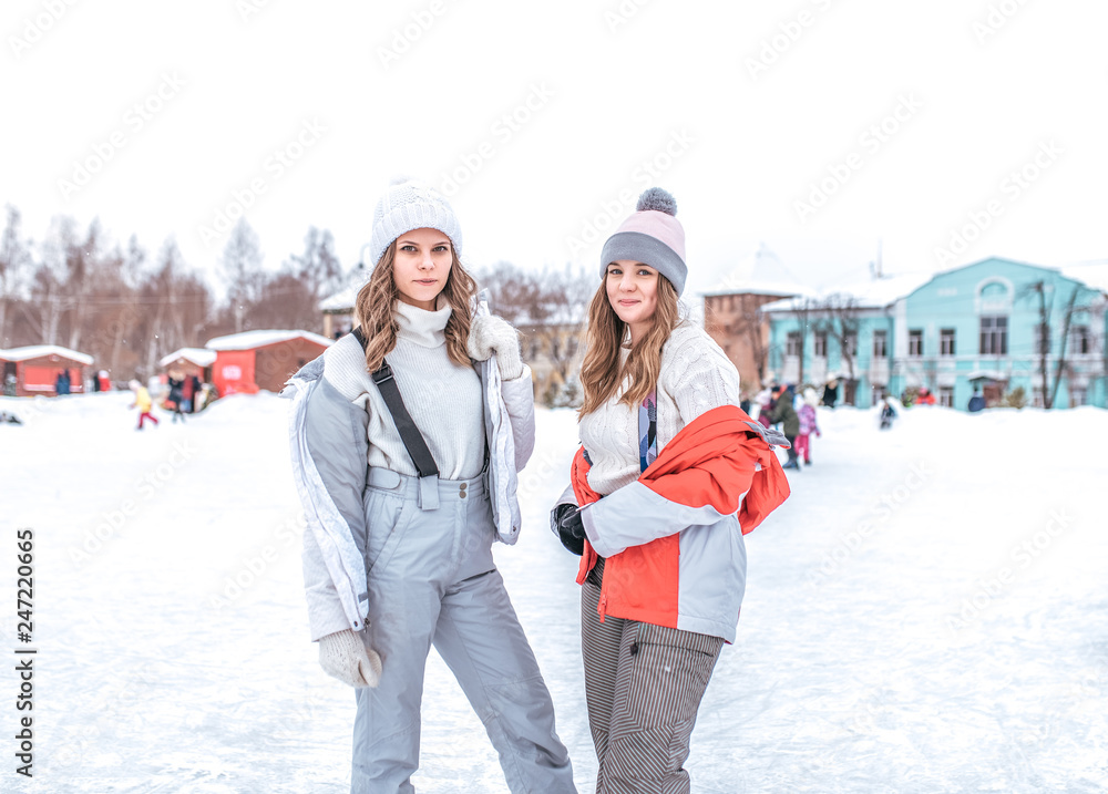Two beautiful girls girlfriends, women sisters happy smiling pose in winter in city. In jackets warm overalls clothing and hats. Rest in winter afternoon on background of people skating on rink.