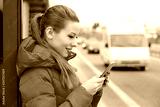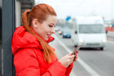 Woman, redhead girl in side profile holding a phone, texting an sms outside on a bus station, near the road in red winter coat clothing. Ordering a taxi concept.