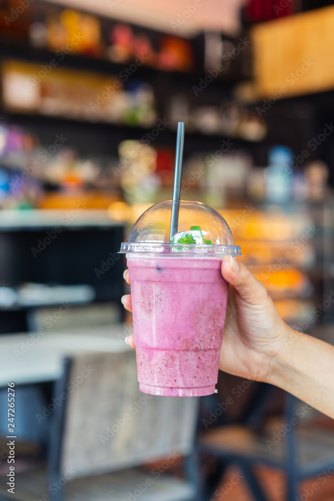 hand holding glass of blueberry smoothies