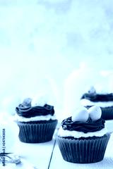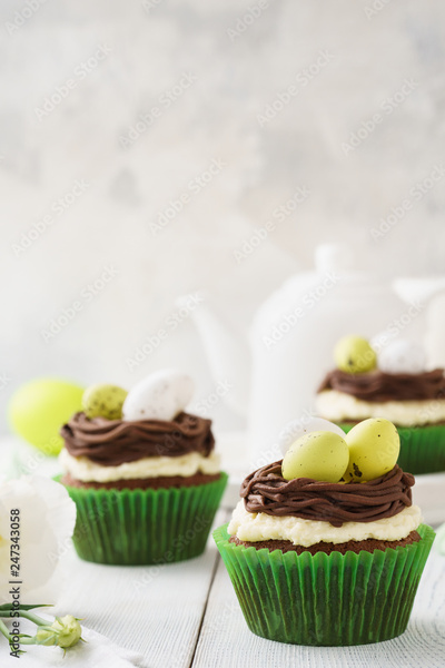 Easter chocolate cupcakes decorated with nest and candy eggs.