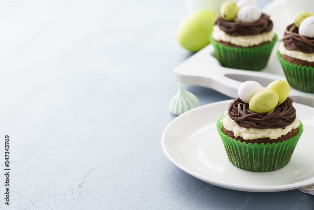 Easter chocolate cupcakes with nest and eggs for dessert.