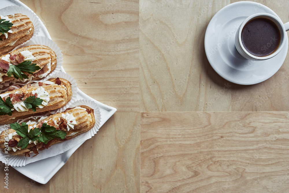 Tasty eclairs on wooden table, close up