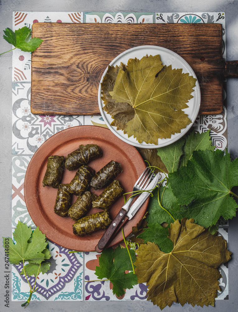 Latin American Mexican Chilean cuisine. Ninos envueltos. Grape leaves stuffed wish meat on clay plate