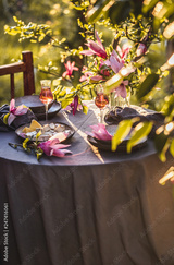 Beautiful table setting in garden on sunset light. Table decorated with magnolia flowers under magnolia tree.