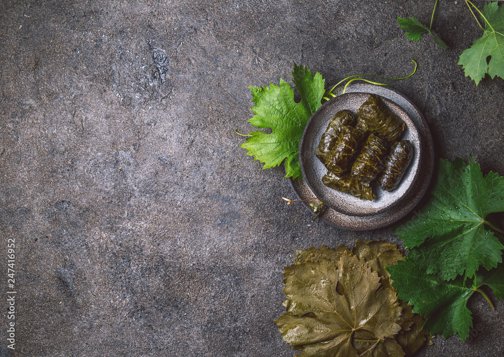Traditional Middle Eastern dolma or tolma. Grape leaves stuffed with meat and rice. On Gray plate, gray concrete background