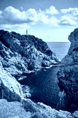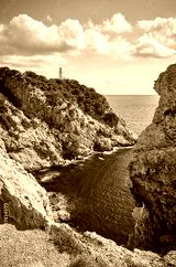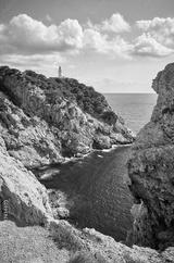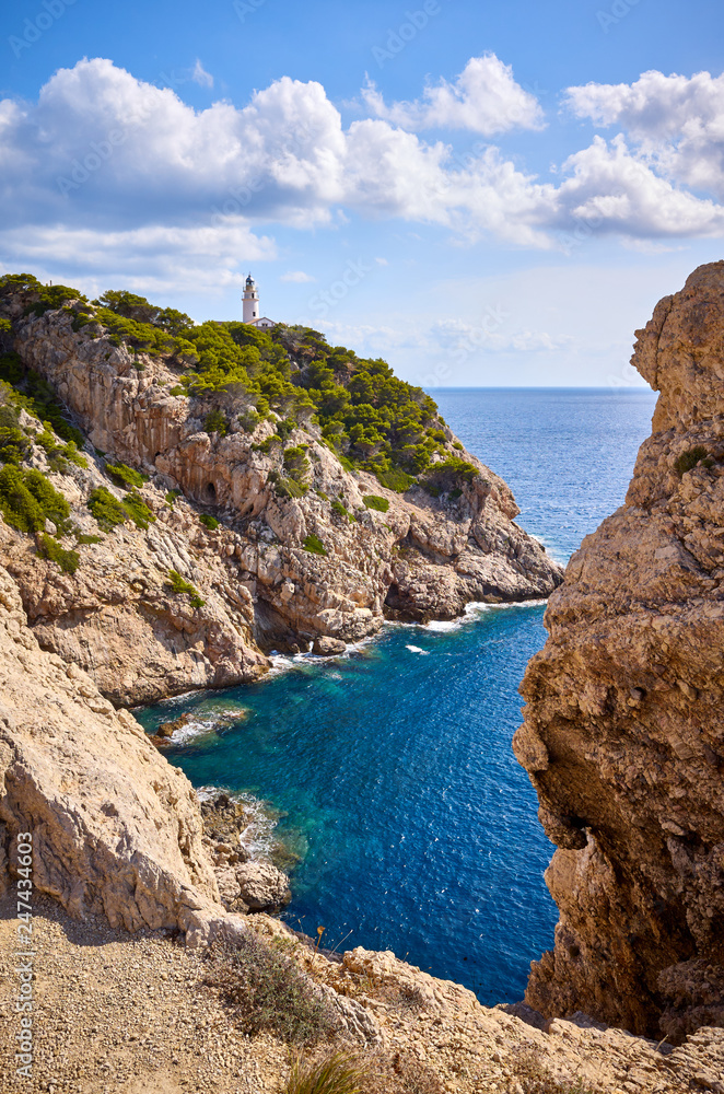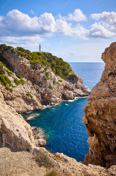 Scenic cove with Capdepera Lighthouse in distance, Mallorca, Spain.
