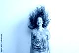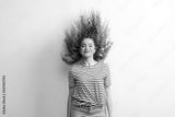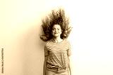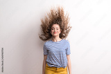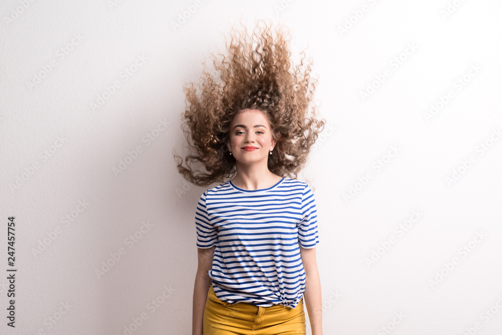 Young beautiful joyful woman with long curly hair in studio, jumping.