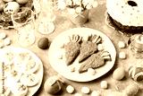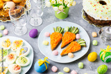 Funny colorful Easter food for kids with decorations on table. Easter dinner concept