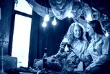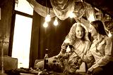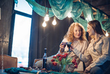Two young women friends celebrate something important near the set table with flowers over a glass of wine at a party.