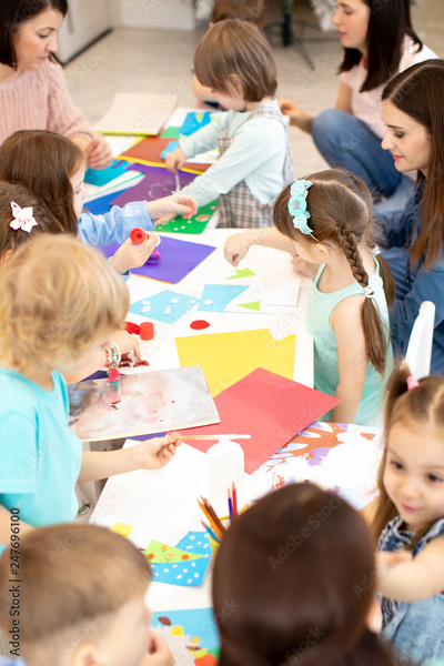 Group of preschool kids working with color paper, sciccors and glue on art class in kindergarten