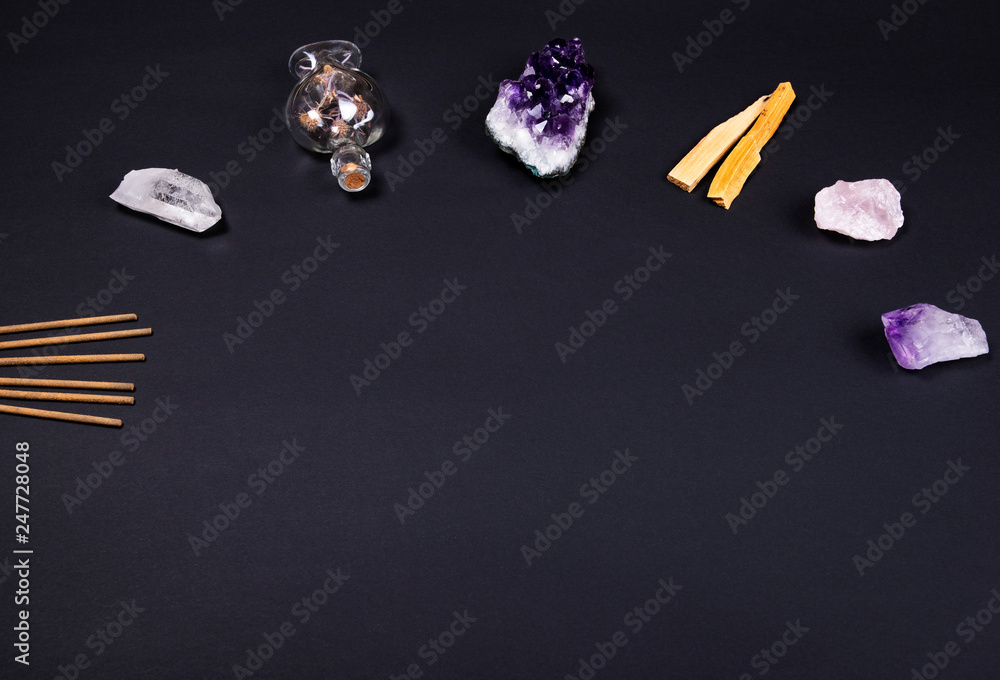 Amethyst and quartz crystal stones, palo santo wood, aromatic sticks and decorative bottle on black background.