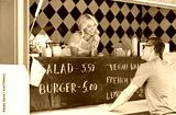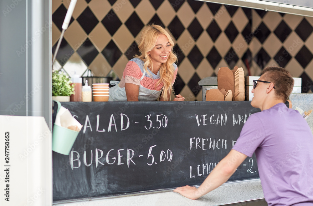 street sale and people concept - happy young saleswoman at food truck serving male customer