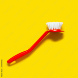 Bright red brush lies on a bright yellow background. In the style of pop art. Top view. Copy space.