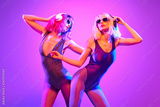 Two sexy fashionable DJ girl in party outfit dance. Colorful neon uv purple blue mixed light. Rave house music vibes. High Fashion. Model woman with glowing Dyed Hair, neon makeup.