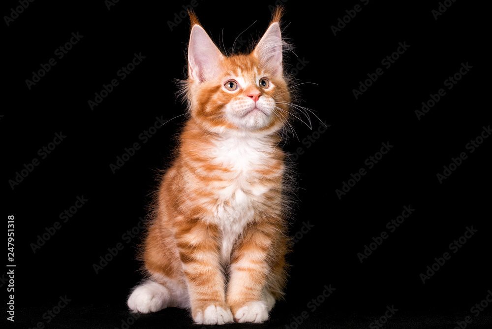 Adorable cute maine coon kitten on black background in studio, isolated.