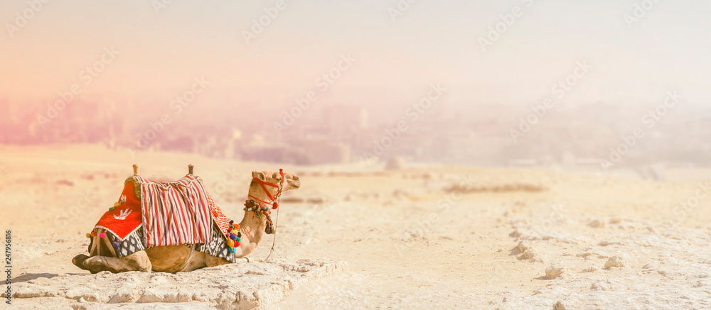 A camel sits on the sand in the desert against the background of a blurred town, with copy space. Giza Egypt