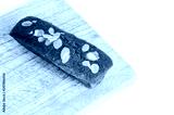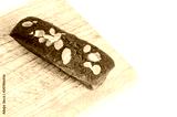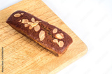 Homemade banana cake with almond and nuts on white background.
