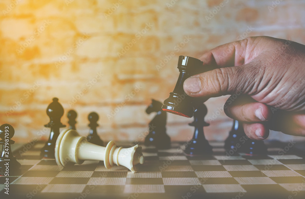 hand of businessman moving chess figure to win competition play. ,business strategy success concept.