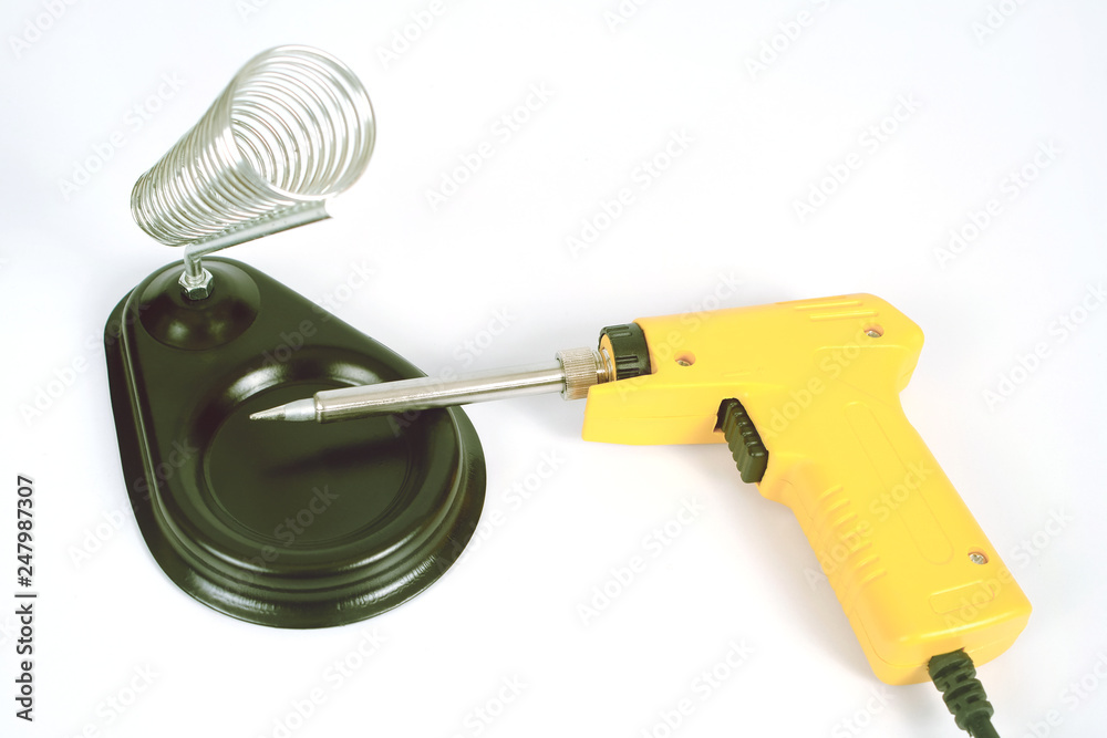 Soldering iron electronic work tool on background.