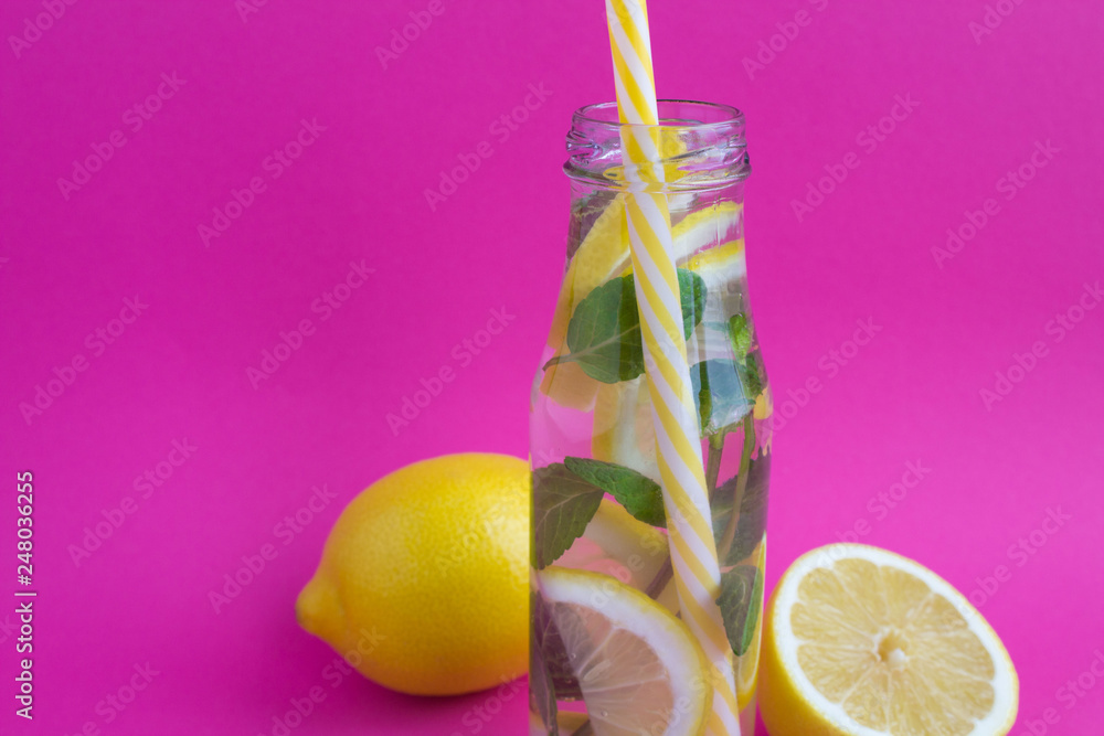Detox water with lemon and mint in the glass bottle on the pink background.Closeup.