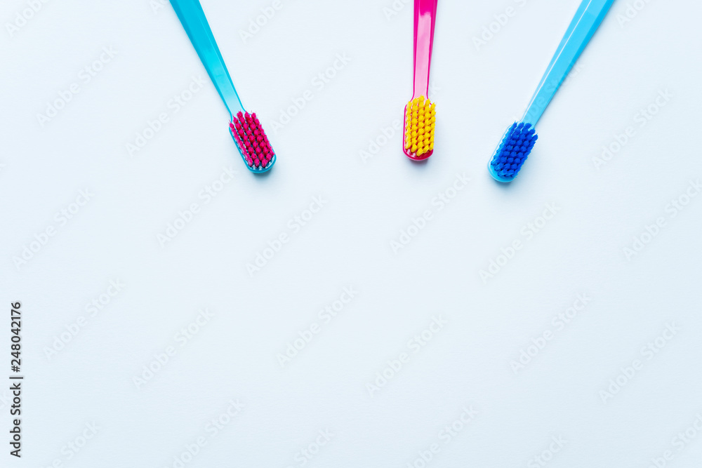 Colorful tooth brushes with bright color bristles on a light pastel blue background. Dental tools with empty space for text for your mockup.