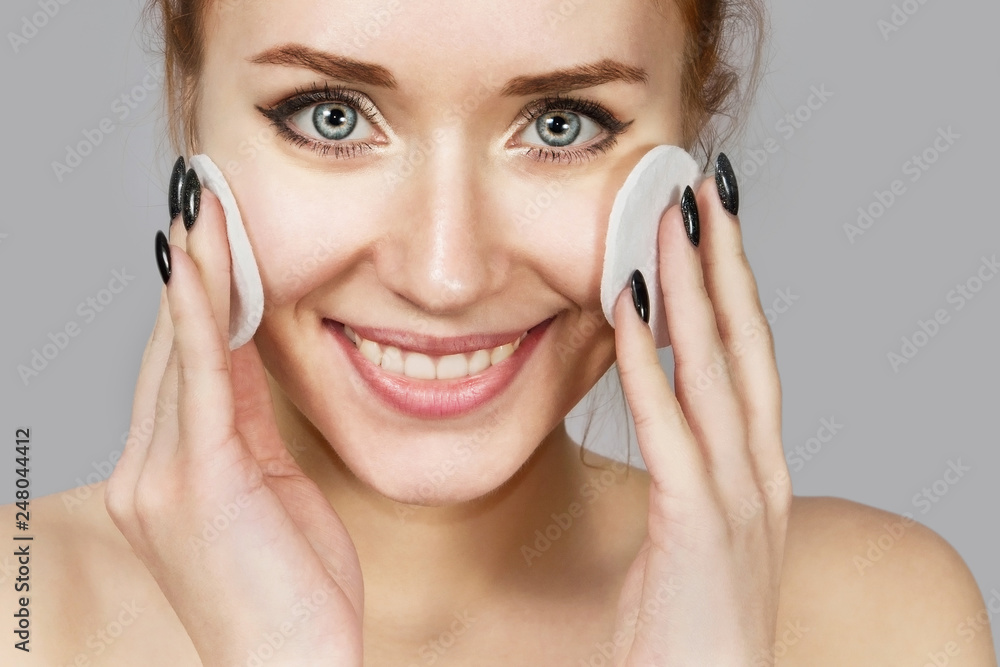 Portrait of cheerful laughing girl applying cotton wool and foam for washing on her face. Lovely woman redhead with attractive appearance. Skin Care spa relax concept on grey background
